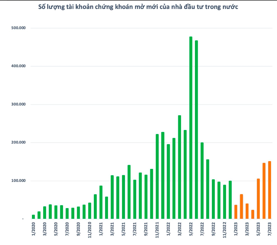 Minh chứng cho điều này là sự gia tăng của nhà đầu tư mới tham gia vào thị trường thời gian gần đây. Trong tháng 7, số tài khoản chứng khoán mở mới đạt hơn 150.000, cao nhất trong vòng 11 tháng. Đây là tháng thứ 3 liên tiếp nhà đầu tư nội mở mới trên 100.000 tài khoản chứng khoán.