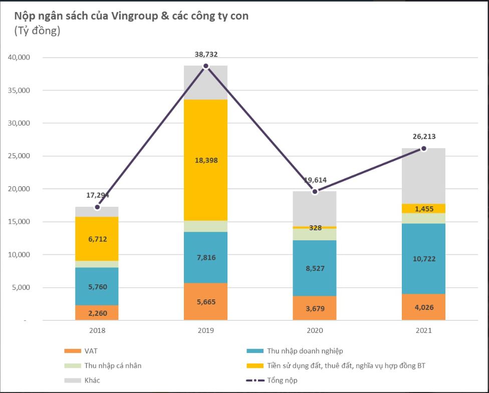 Theo dữ liệu tại báo cáo tài chính của Vingroup, năm 2021, Tập đoàn và các công ty con đã nộp tổng cộng 26.213 tỷ đồng tiền thuế cho Nhà nước, tăng 25,2% thuế phải nộp so với năm 2020. Trong đó, Vingroup chỉ trực tiếp nộp hơn 2.200 tỷ. Phần lớn nhất thuộc về công ty con Vinhomes với 12.600 tỷ. VinFast cũng nộp khoảng 5.000 tỷ vào ngân sách Thành phố Hải Phòng.